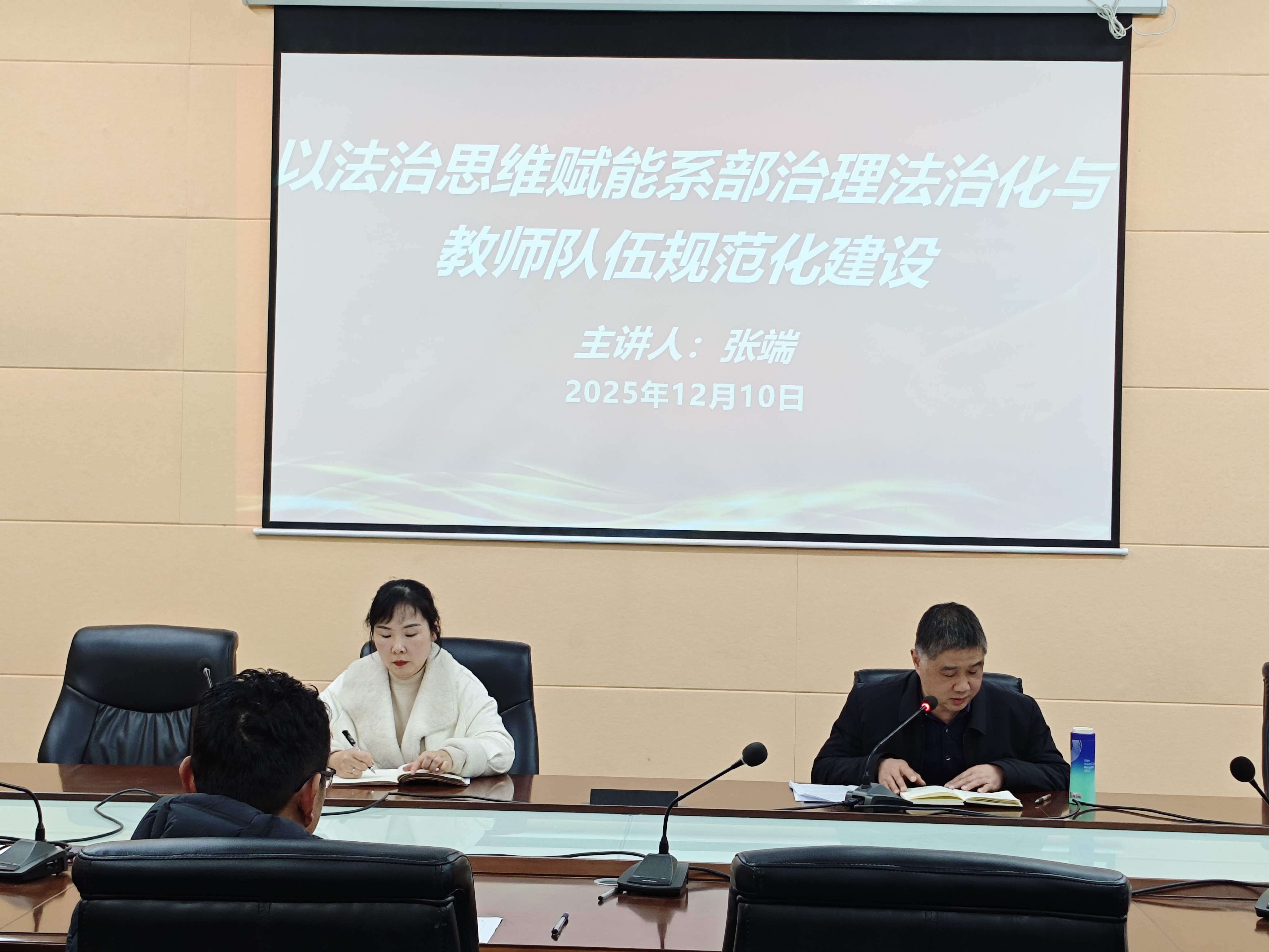 下午,张端书记以《以法治思维赋能系部治理法治化与教师队伍规范化建设》为主题讲授党课。强调,一是要深学细悟习近平法治思想,把握法治治教的根本遵循。二是要践行法治思维治系,把 “依法依规” 融入工作各环节。在教学管理中守好“法治底线”,在师资建设中筑牢“法治防线”,在学生管理中体现“法治温度”。三是要强化纪律意识与规矩意识,争做依法执教的表率。把“纪律规矩”刻在心里,把“示范引领”扛在肩上。
